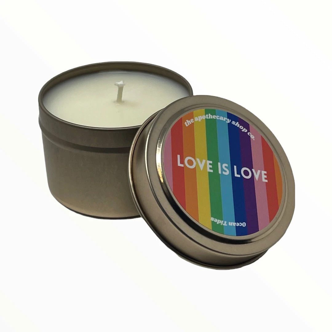 Pride Candle Ocean Tides from the Apothecary Shop. Immerse yourself in the aromas of waves crashing onto a rocky coastline with a storm brewing in the distance. Our Ocean Tides fragrance oil evokes the churn of the sea, wrapping the water, sand and salt together into a clean and ozonic scent.
