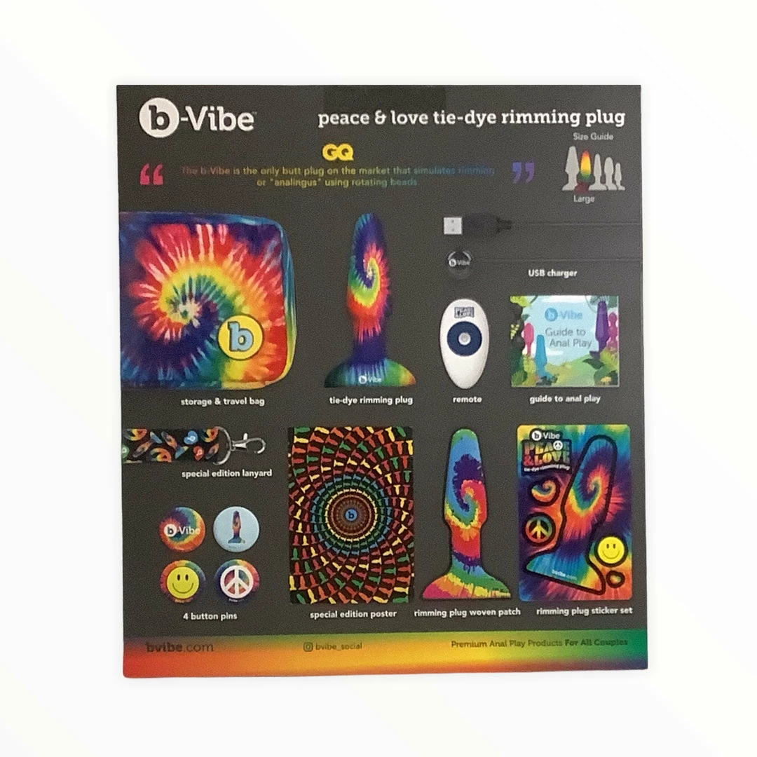 To embrace an era of euphoric sex, B-Vibe created their most distinctive plug yet! Each Peace & Love Rimming Plug passes a special tie-dye process that’s 100% body-safe and makes the toy genuinely unique.