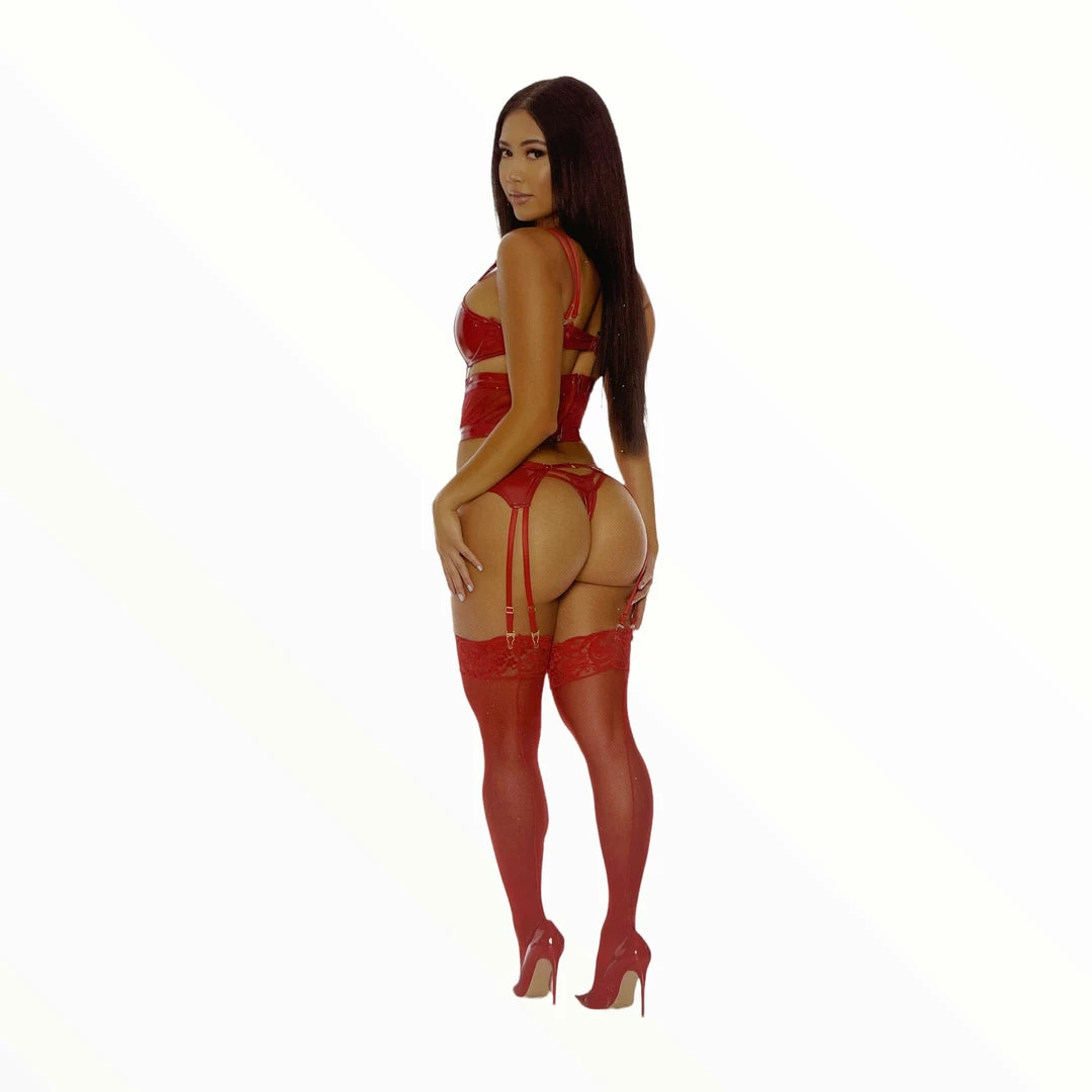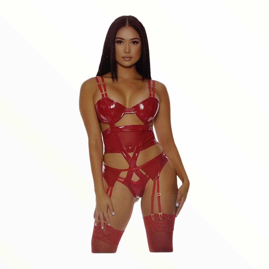 2pc. teddy lingerie set features vinyl fabrication with midsection mesh panel and cutouts paired with double strap garter belt.