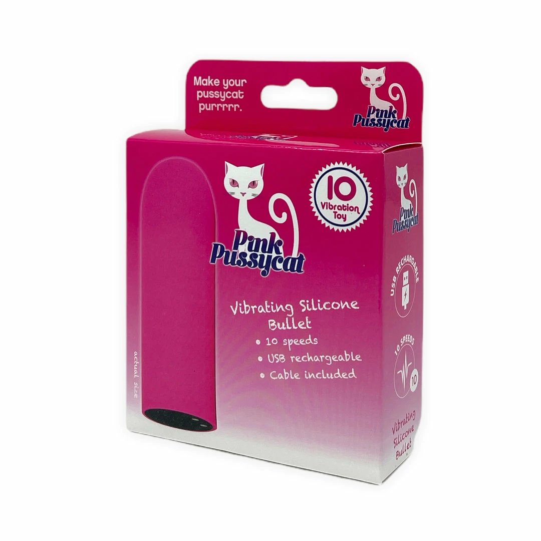 By the way, you can say so long to batteries, because the Bullet Vibrator is fully USB rechargeable. Charge cord included. In body safe silicone, the Pink Pussycat Rechargeable Bullet