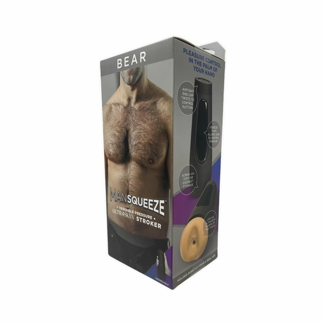 Bear features a larger exterior ass shape in lifelike ULTRASKYN, with a tight hole at the entry that relaxes deeper inside. Just like its Main Squeeze counterparts, this stroker is crafted with a unique internal texture. The double-cap hardshell design doubles as a discreet travel and storage case, keeping your Man Squeeze fresh and ready for whenever the mood strikes.Â