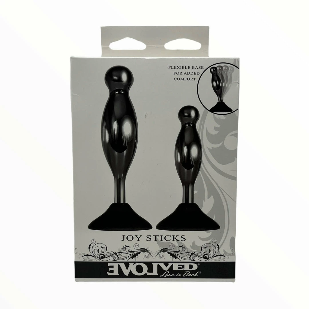 Explore delicious hands-free back-door play with this two-piece plug set that gives new meaning to the term ‘joystick!’ Each silicone base powerfully suctions onto any clean surface while the black chrome-finished alloy shape bobs and swirls in place wherever you crave it most!