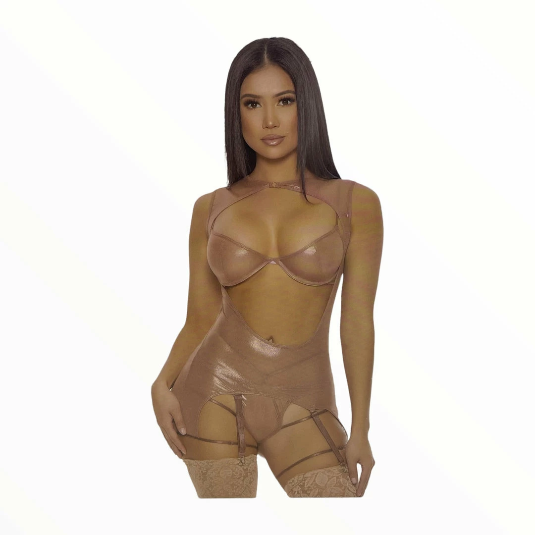 3pc. Lingerie set features metallic sheer mesh high-neck underwire bra paired with strappy cutout panty paired with high neck cutout bustier with attached garters and garter straps.