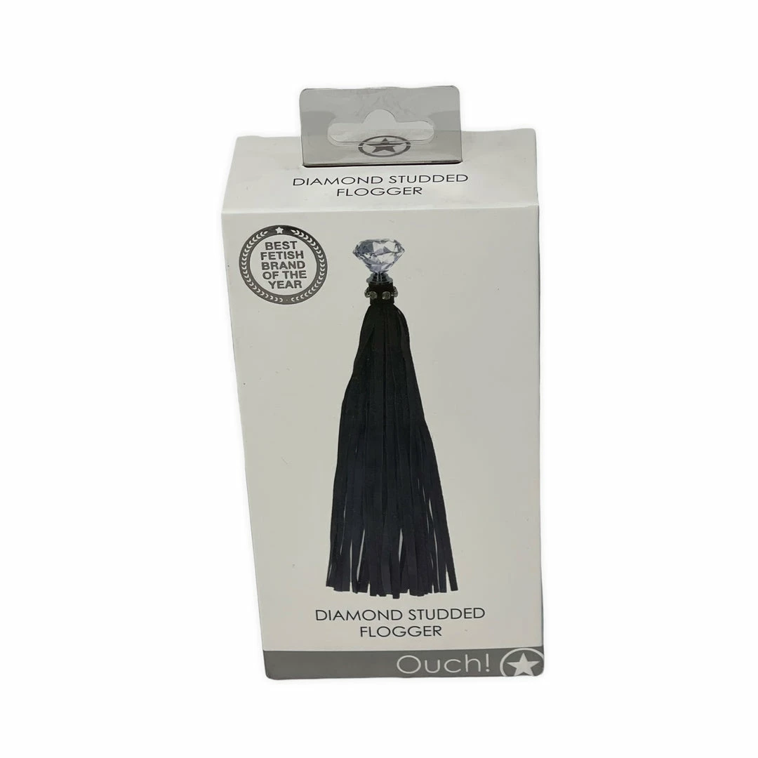 Diamond Studded Whip Black from Ouch line Shots Toys. Get ready to please or receive in the intense Diamond BDSM line. Glamorously tough, the perfect combination of firm faux leather and glamorous diamond studs will turn you into the star attraction of the night.