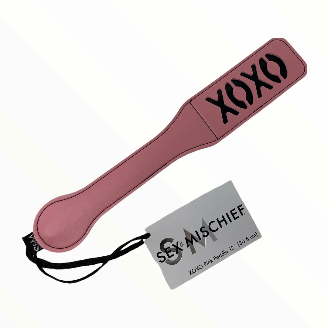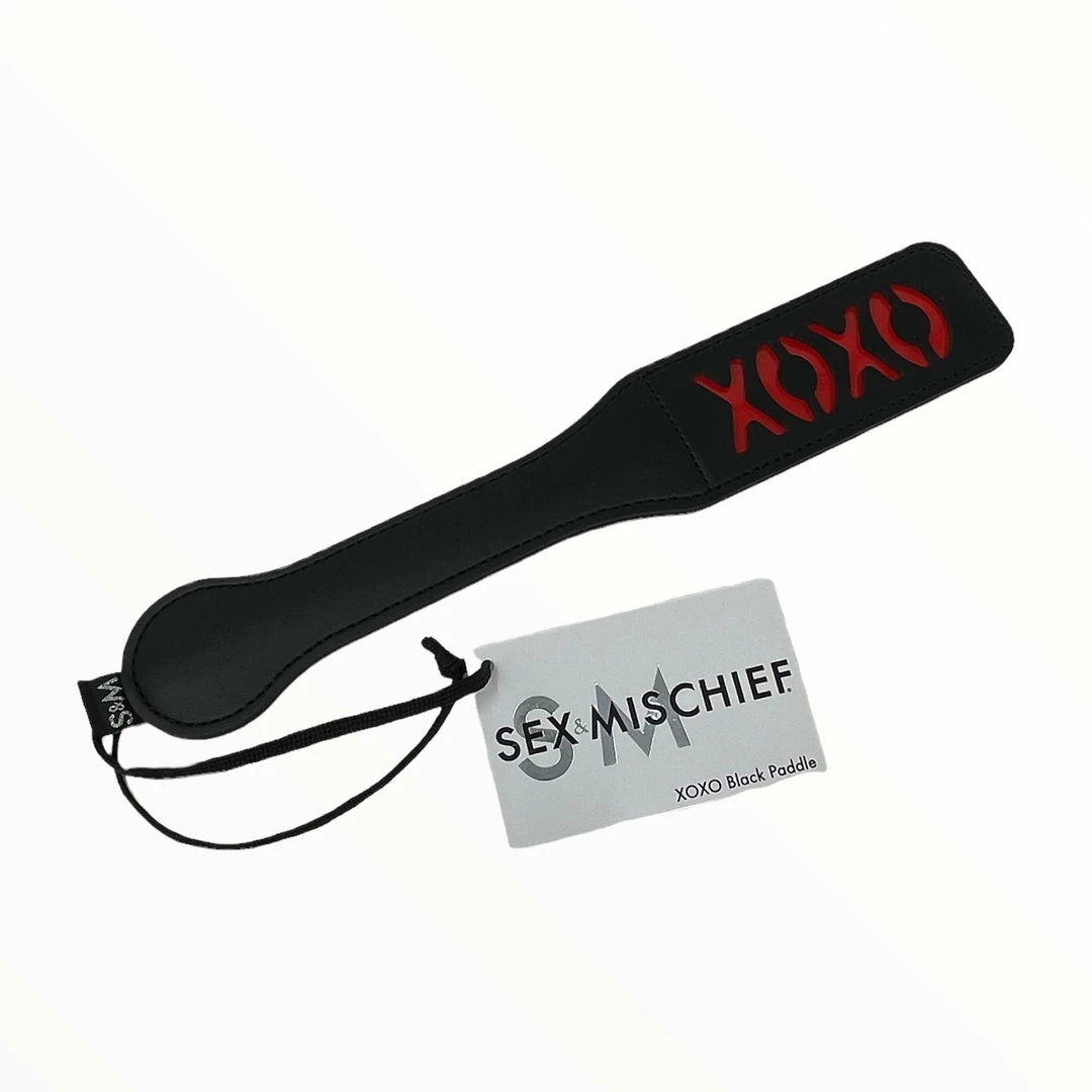 Sex and Mischief Blush XOXO Pink/Black Paddle is a sexy way to truly leave your mark. The Blush XOXO paddle has two sides to let you pick your pleasure, administer playful punishment with the smooth back side or pink XOXO side, with special cutouts that leave their shape on the skin!