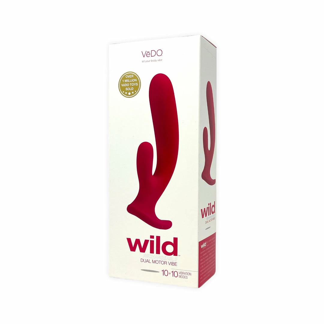 Vedo Wild Rechargeable Dual Vibe Pink. Vibrator runs on two independent extremely powerful motors. 3 speeds and 7 vibration modes. The flexible shaft will tickle and delight your g-spot while the external tickler teases your clitoris.